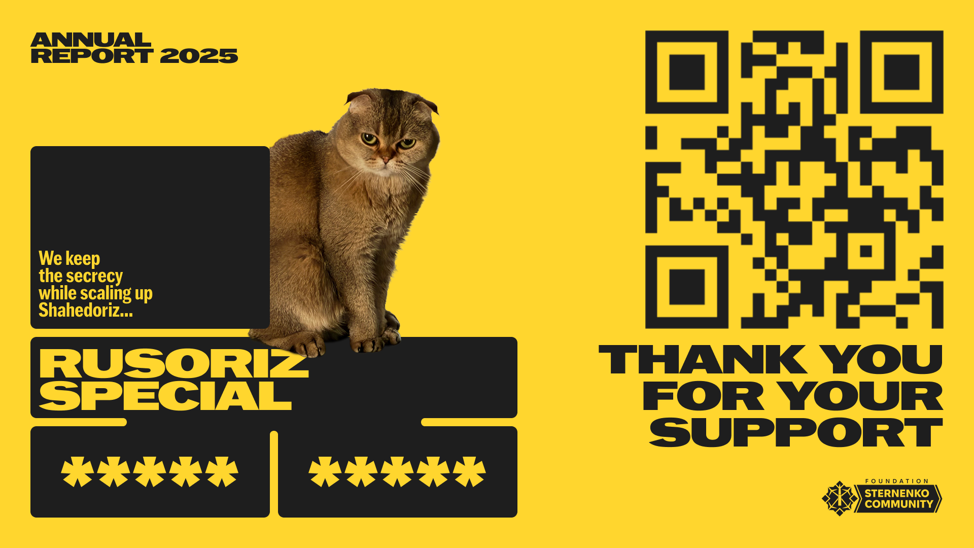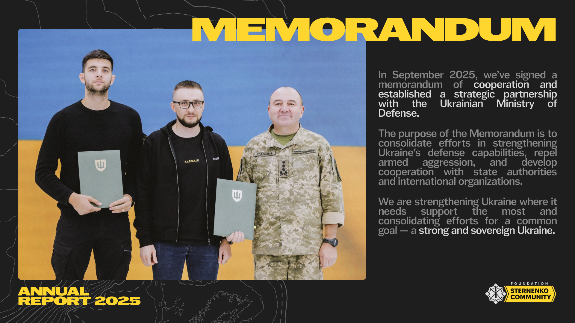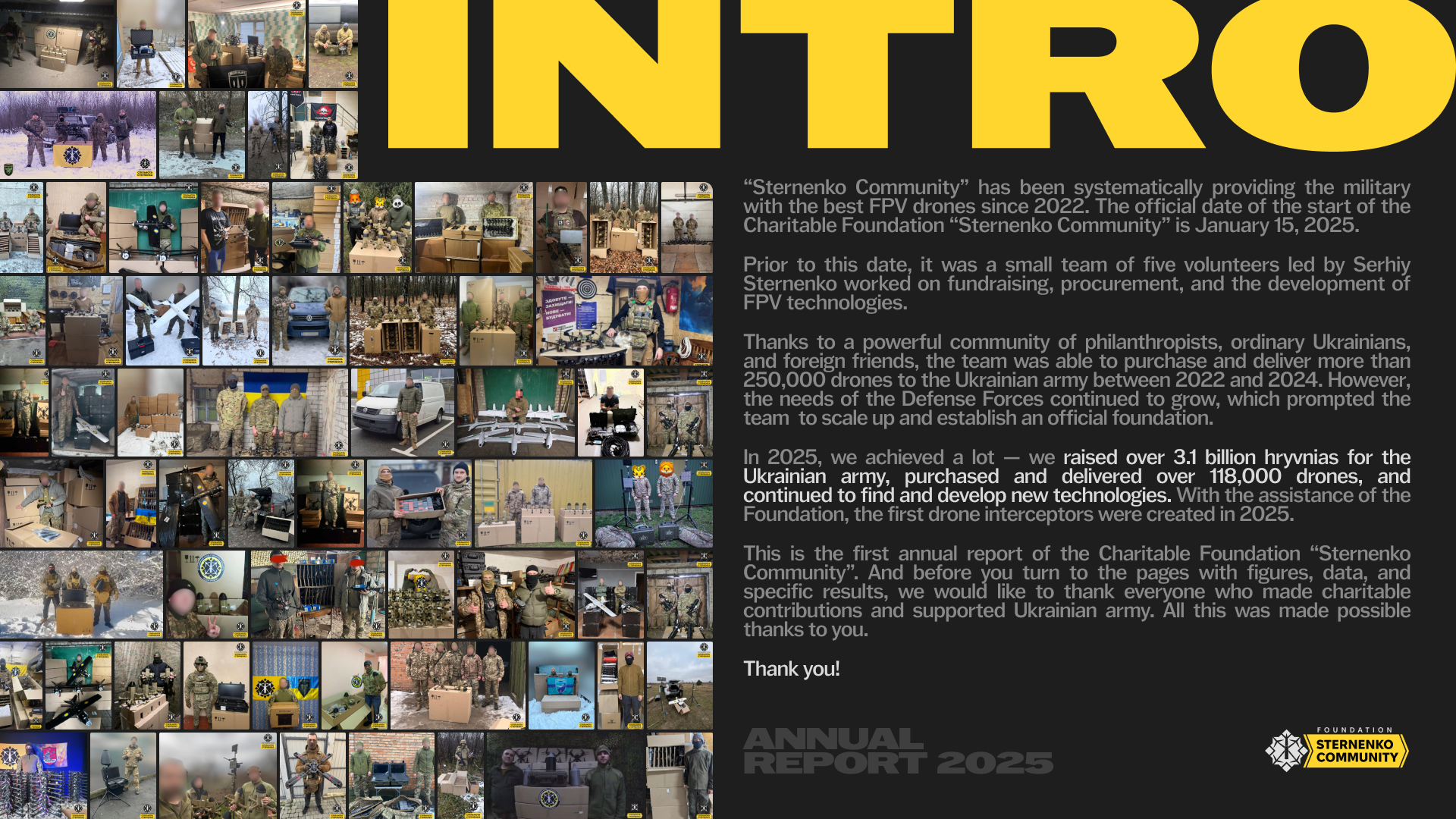 This is the first annual report of the Sternenko Community Charitable Foundation. And before you turn to the pages with figures, data, and specific results, we would like to thank everyone who made charitable contributions and supported the army. All this was made possible thanks to you. Thank you!