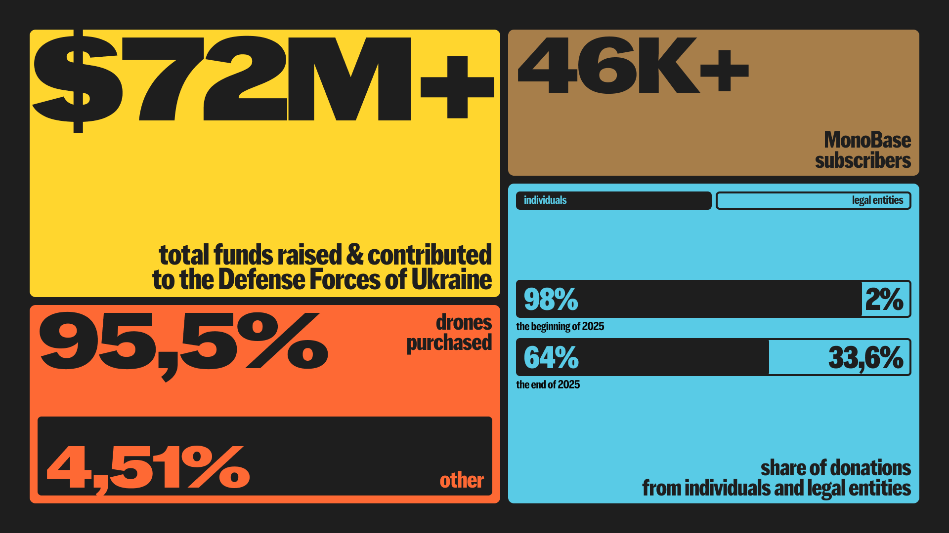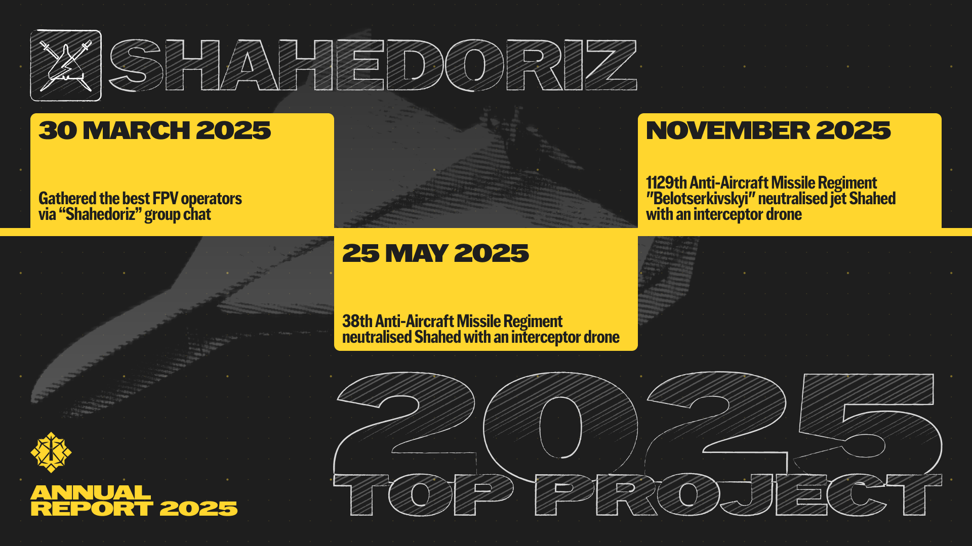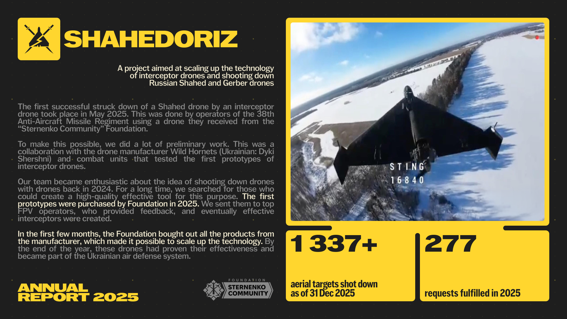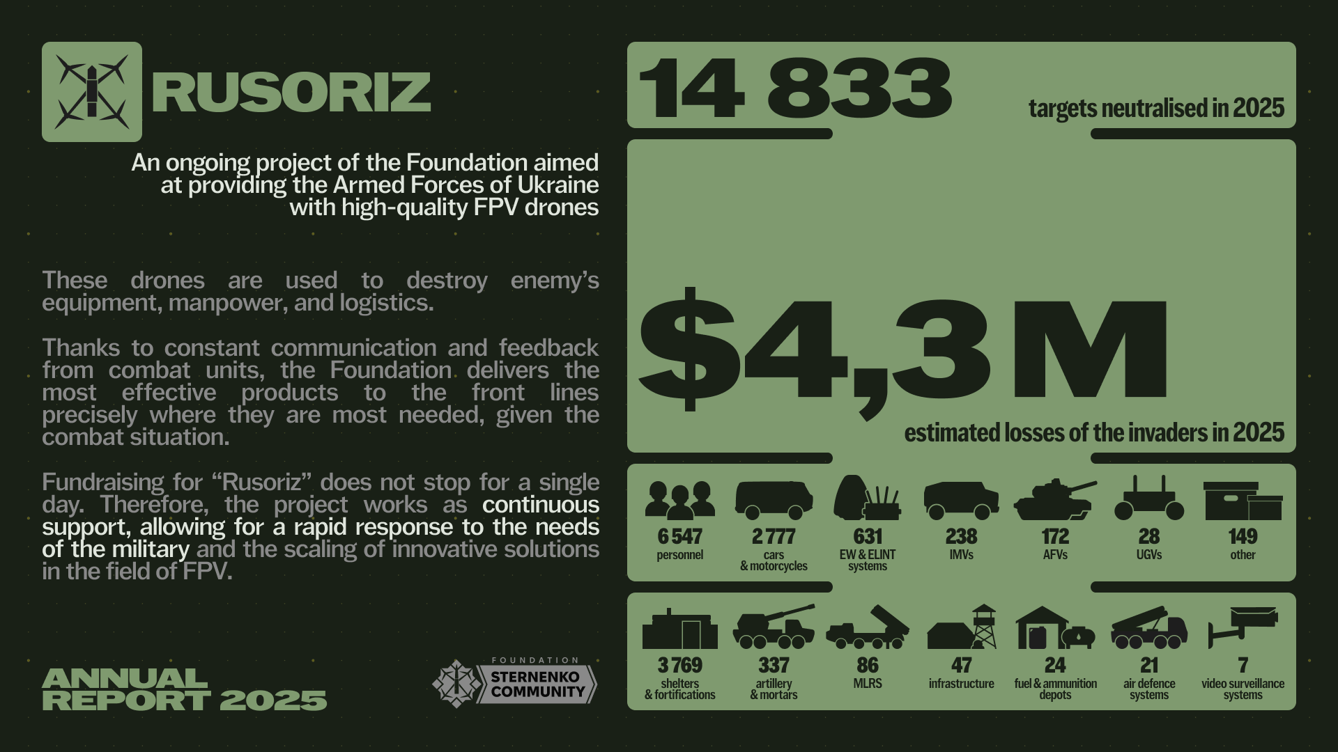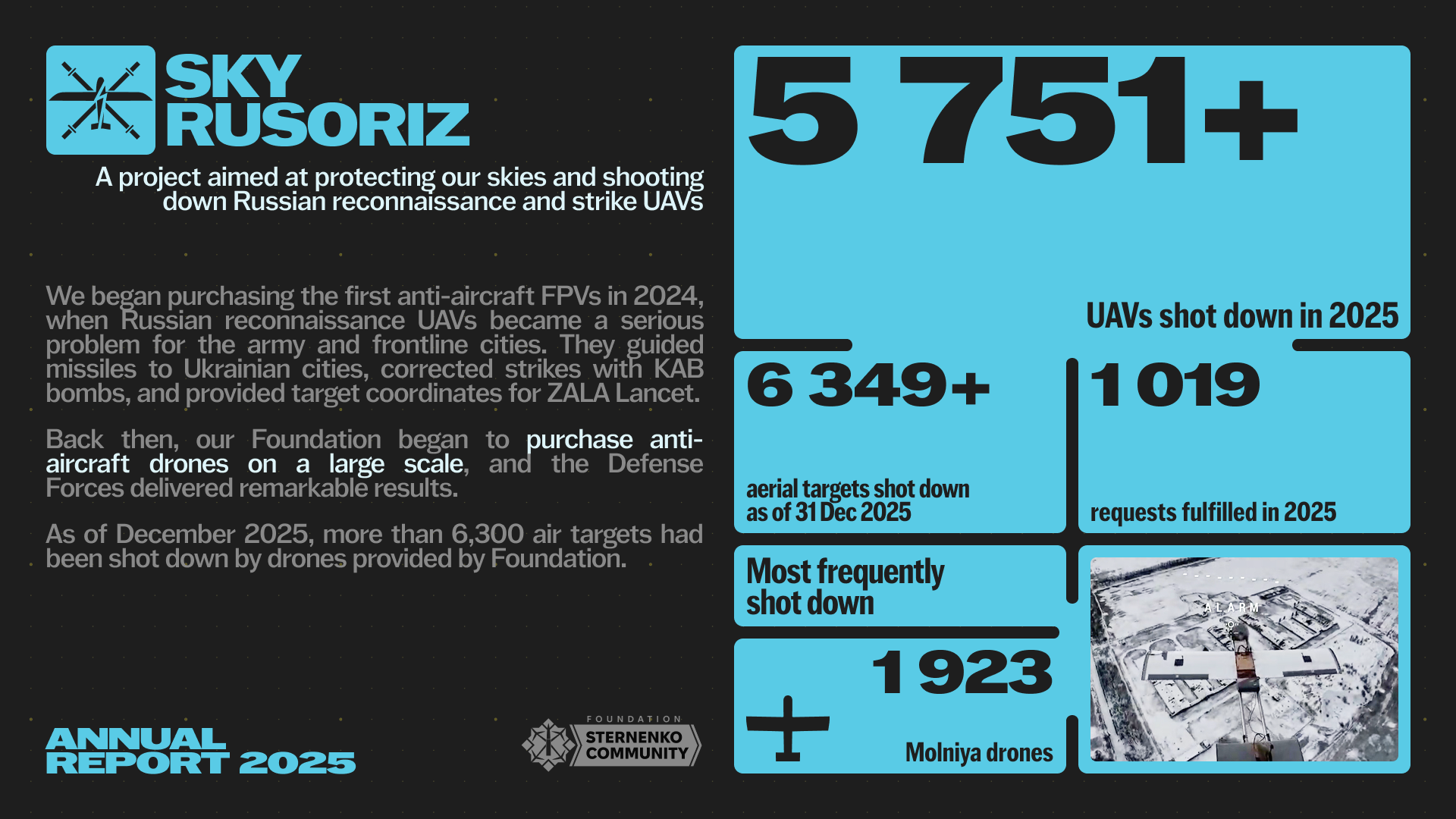 In 2025, we achieved a lot — we raised over 3.1 billion hryvnias for the army, purchased and delivered over 118,000 drones to the military, and continued to find and develop new technologies. Thus, with the assistance of the Foundation, the first drone interceptors appeared in 2025.