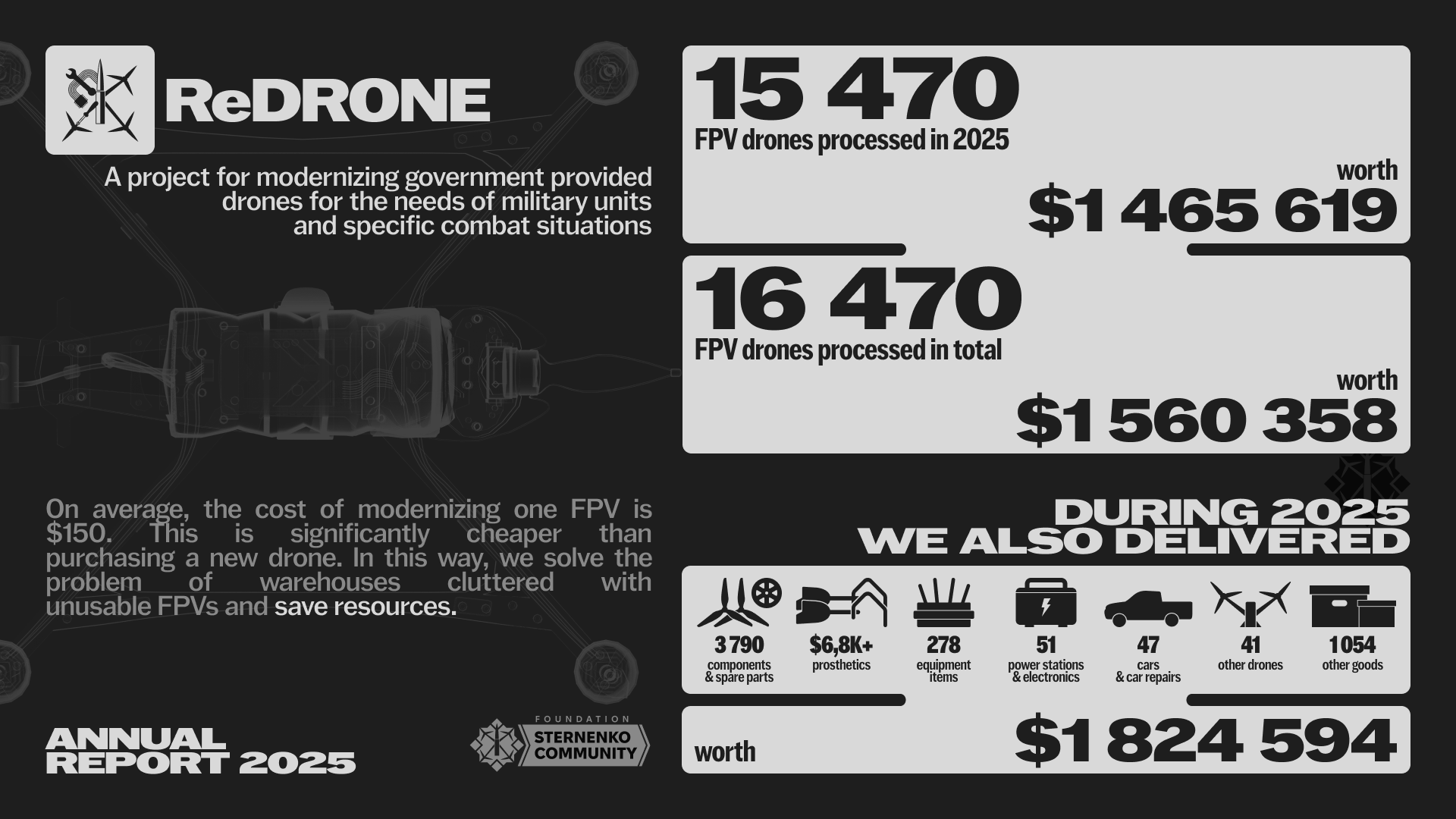 The Sternenko Community has been systematically providing the military with the best FPV drones since 2022. At the same time, the official date of establishment of the Sternenko Community Charitable Foundation is January 15, 2025. Until then, a small team of five volunteers led by Serhiy Sternenko worked on fundraising, procurement, and the development of FPV technologies. However, thanks to a powerful community of philanthropists, ordinary Ukrainians, and foreign friends, the team was able to purchase and deliver more than 250,000 drones to the army between 2022 and 2024. However, the needs of the Defense Forces continued to grow, which prompted the team to scale up and institutionalize.